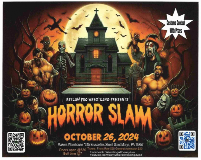 Asylum pro wrestling takes over St.Marys Pennsylvania @ the Makers Warehouse (315 Brusselles street St.Marys Pa 15857. 8 action packed matched featuring 3 title matches! See stars like Hype Man Dan Lasers , Orso Polare , Uggie the Caveman, The lunachick Alura O shea and the Lunatic himself Crazii Shea !