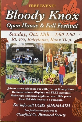 Join us as we celebrate our 20th year at Bloody Knox. Tour the cabin: demonstrations, displays, and FREE samples. Make rope, churn butter, and grind apples on our 1900s cider press. First 100 kids decorate a pumpkin.