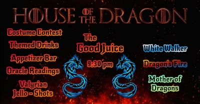 Welcome to The House of the Dragon. Featuring the one and only Good juice at 9:30pm. Raven’s Moon oracle readings at 8pm. Themed Westerosi Drinks, Valyrian Jell-O shots, and a costume contest to rival that of Dorne itself.