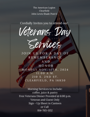 Meal is FREE to Veterans and 1 Guest. Please stop by the canteen to register by 11/01/2024.