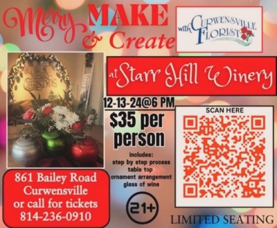 Friday December 13th at 6pm, we will be hosting a Merry Make and Create arrangement class in collaboration with Starr Hill Vineyard & Winery! Come on up and enjoy the evening with us! Ticket purchases can be made directly through the QR code or by calling the winery at (814)236-0910. Limited seating available!