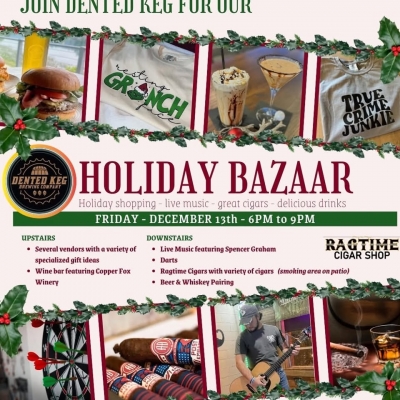 Join us for our first-ever holiday bazaar! We'll have some awesome vendors upstairs for Christmas shopping (support local!), Ragtime Cigars -with a smoking area on the patio!- a wine bar and drink specials, live music featuring Spencer Graham, our NEW dart boards open for use and more!