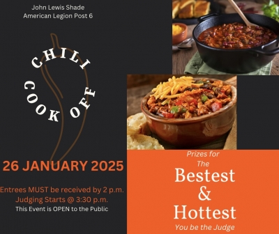 Open to the Public No Entry Fee Chili entries should be received no later than 2:00 p.m. Judging Starts @ 3:30 p.m. 2 Winners announced, Bestest & Hottest by popular vote. Come be the Judge this year.