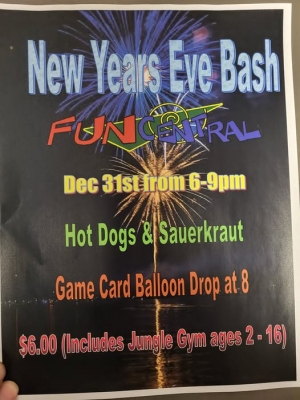 We are gonna try something new this Year for New Years Eve! We are going to have our New Years Eve Party earlier to accommodate the younger kids and Families that don't want to stay up late or have other plans! We will have our Annual balloon drop at 8pm sharp and from 6-9 pm will have game card and food specials. Price will be $6.00 per child Admission that will include the Jungle gym admission and a hot dog. Mark your calendars now for this special event!