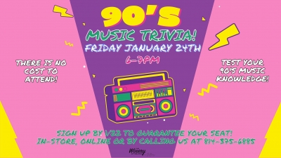 Join us Friday January 24th from 6-7pm to test your knowledge of one of the greatest decades in music, the 90's!