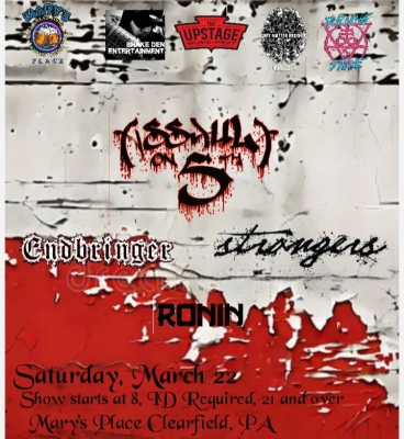Metal night makes it's long overdue return to Mary's Place in Clearfield, PA. We're bringing the young metalheads, Ronin from Pittsburgh, Clearfield's own Endbringer, heavy hitters Strangers from Pittsburgh, and Phillipsburg's Assault on 5th. Show starts at 8, ID required, this is a 21 and over event. No Cover!!! Let's roll!!!