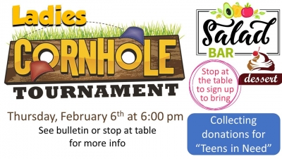 Ladies Cornhole Tournament Thursday Feb 6th at 6pm. We'll be having a salad bar and desserts. Stop by the Women's Ministry table and sign up to bring a salad topping or dessert.