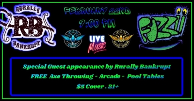 LIVE MUSIC NIGHT Featuring: Fuzzii - Special Guest appearance by Rurally Bankrupt. FREE Axe Throwing, arcade & free Pool tables! Specialty cocktails will be announced soon. $5 Cover. 21+