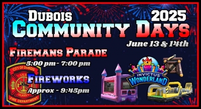 Community Days Returns for 2025, along with the traditional Firemen's Parade! Hosted once again by the Dubois Fire Department! Join us in celebrating this annual event, June 13th 5pm-10pm & June 14th 2pm-10pm. Inflatable rides & stations provided by Invictus Entertainment! Updates & Details on the Dubois Fire Department Page.