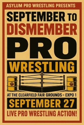 Join Asylum Pro Wrestling and all the stars you have come to love and hate as we invade the Clearfield Fairgrounds Sept 27. Defiant Order of Wrestling and Asylum Pro Wrestling have teamed up to bring you 9 Action packed matches including the Slugfest Battle Royal. With Asylum Joining forces with Defiant this means you will be seeing a whole new crew of wrestlers entering the rumble. It truly is Anyone's game! Welcome to the ASYLUM!
