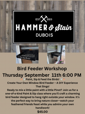 Ready to mix a little paint with a little Pinot? Join us for a one-of-a-kind Paint & Sip class where you'll craft a charming bird feeder designed to hang right outside your window. It's the perfect way to bring nature closer—watch your feathered friends feast while you admire your own handiwork!