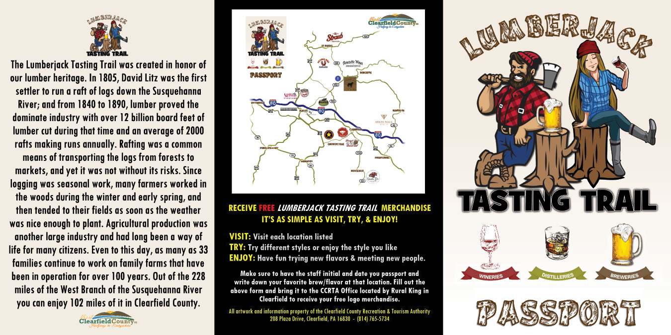 The Lumberjack Tasting Trail was created in honor of our lumber heritage. In 1805, David Litz was the first settler to run a raft of logs down the Susquehanna River; and from 1840 to 1890, lumber proved the dominate industry with over 12 billion board feet of lumber cut during that time and an average of 2000 rafts making runs annually. Rafting was a common means of transporting the logs from forests to markets, and yet it was not without its risks. Since logging was seasonal work, many farmers worked in the woods during the winter and early spring, and then tended to their fields as soon as the weather was nice enough to plant. Agricultural production was another large industry and had long been a way of life for many citizens. Even to this day, as many as 33 families continue to work on family farms that have been in operation for over 100 years. Out of the 228 miles of the West Branch of the Susquehanna River you can enjoy 102 miles of it in Clearfield County.